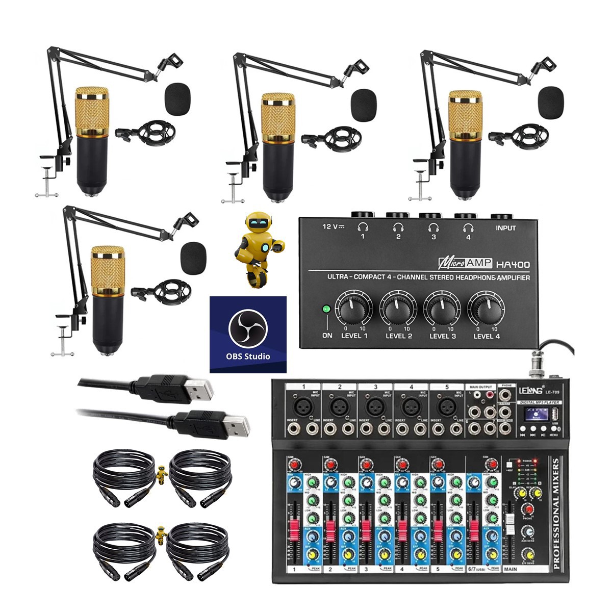 Novo Sistema de Audio Para Podcast Mesa interface USB Bluetooth Com 4 Microfone Profissional Sistema Braço Articulado + 4 Cabos Balanceado + 1 Cabo USB